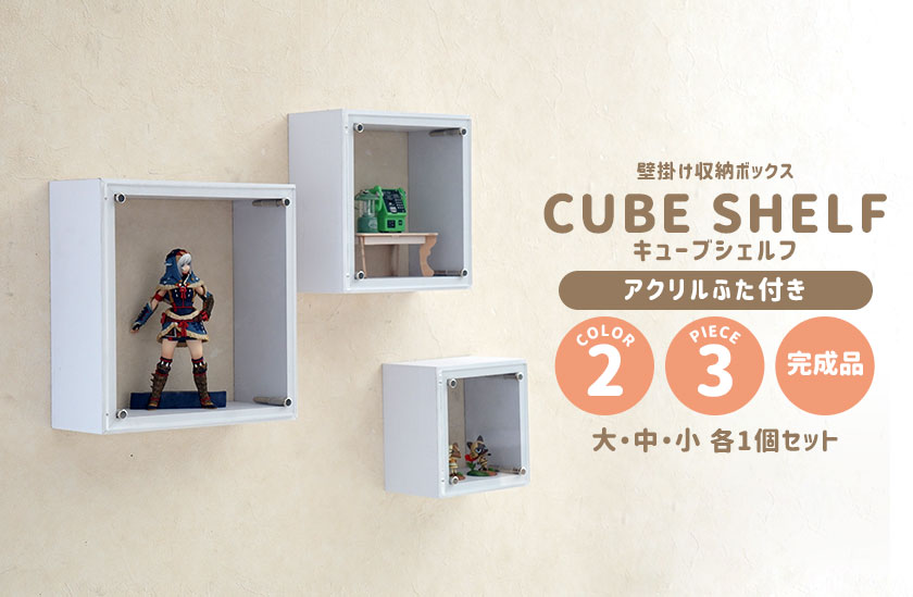 キューブシェルフ アクリルふた付き 大・中・小 各1個セット 【本体外寸】 大…25cmx25cmx9cm 中…20cmx20cmx9cm 小…15cmx15cmx9cm 【本体内寸】 大…22cmx22cmx9cm 中…17cmx17cmx9cm 小…12cmx12cmx9cm 【アクリルふた寸法】 大…24cmx24cm 中…19cmx19cm 小…14cmx14cm 厚さ 各種4mm 【材質】 本体素材:木材 アクリルふた素材:アクリル樹脂 金属脚(シャフト)…スチール 【重量】(アクリルふた装着時) 大…1260g 中…930g 小…710g 安全過重:各種3kg 【付属品】壁固定用ネジ 6本 【生産国】 本体:中国 アクリルふた:日本 【完成品】 シェルフ本体は完成品です。